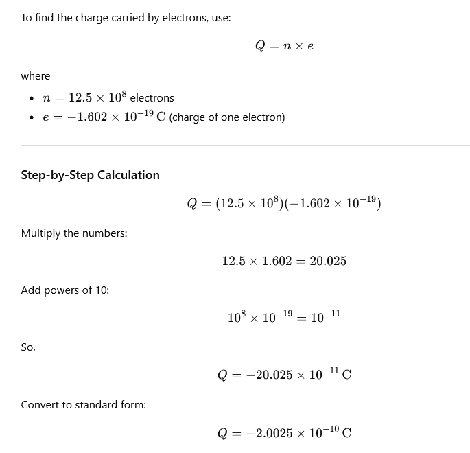 Question: Calculate the charge carries by 12.5 X 10^8 electrons?