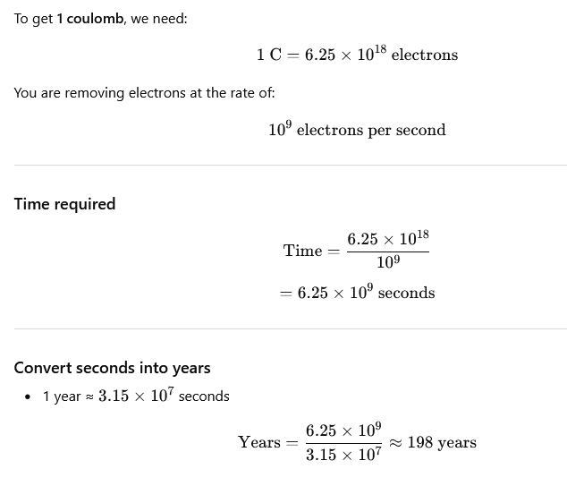Question: If a body gives out 10^9 electrons every second. How much time is required to get a total charge of 1 C from it? Post author:vicro.inn@gmail.com Post published:November 14, 2025 Post category:Chapter : 01 Electric charges and fields Post comments:0 Comments You Might Also Like Question: An electron moves a distance of 6 cm when accelerated from rest by an electric field of strength 2 x 10^-4 N/C. Calculate the time of travel. The mass and charge of electron are 9 x 10^-31 kg and 1.6 x 10^-19 C respectively. November 15, 2025 Question: Calculate the charge carries by 12.5 X 10^8 electrons? November 14, 2025 Question: How much positive and negative charge is there in a cup of water? [NCERT] November 14, 2025 Leave a Reply Cancel replyCommentEnter your name or username to comment Enter your email address to comment Enter your website URL (optional) Save my name, email, and website in this browser for the next time I comment.