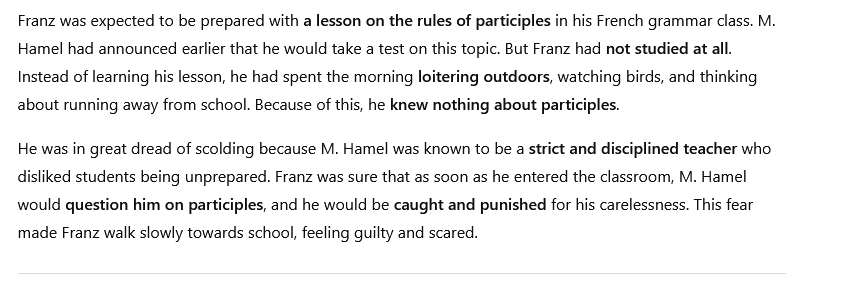 • Question: What did M. Hamel tell the people in the class about French language ? What did he ask them to do and why? (Or) How does M. Hamel pay a tribute to the french language ?